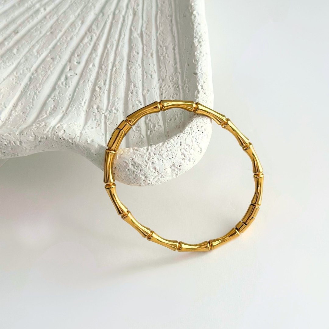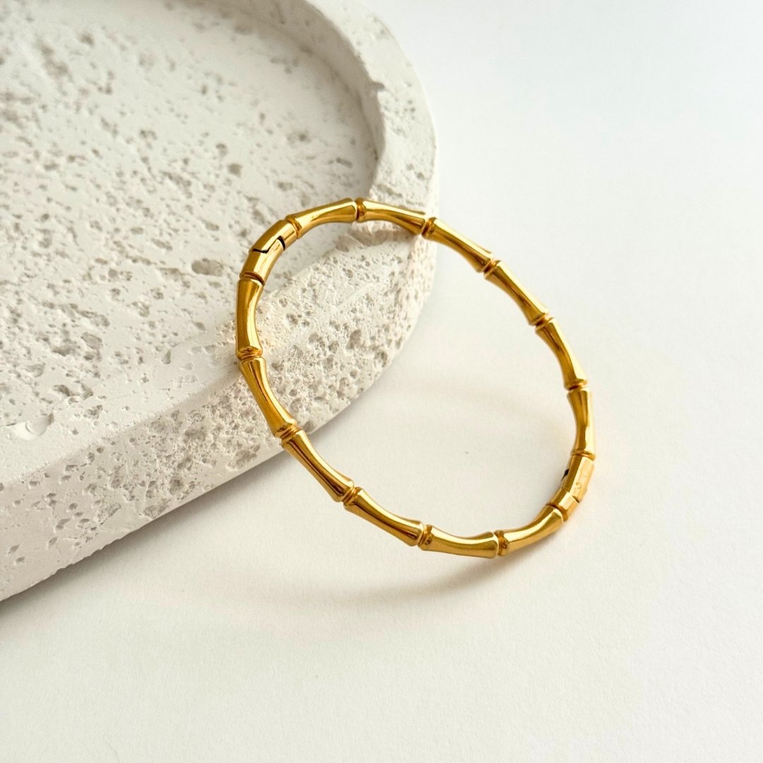 Introducing Léa – a bold bamboo-inspired cuff bangle that channels organic elegance with urban edge. This statement piece mimics the sleek lines of bamboo stalks through its sculpted metallic design, offering the look of nature with contemporary durability. The rigid yet lightweight cuff slips on effortlessly, its golden finish catching the light with every movement. Perfect for adding architectural interest to minimalist outfits or complementing boho-chic styles, Léa bridges natural inspiration with fashion-forward versatility. The scratch-resistant finish ensures this artful bracelet maintains its polished look through every wear.