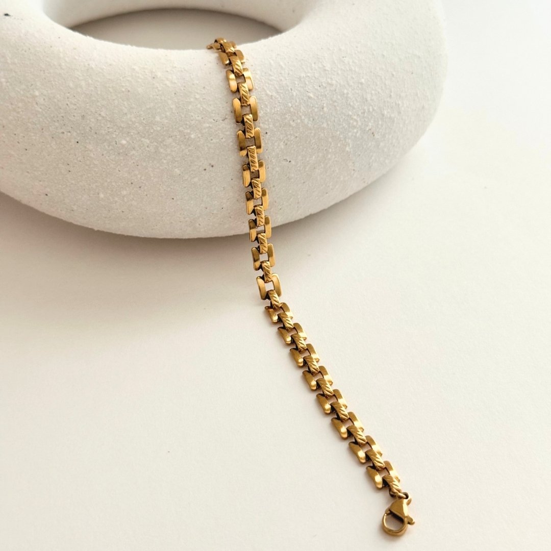 Make a powerful style statement with our watch band bracelet. This bold yet refined piece features a sleek, architectural design in gleaming gold-plated stainless steel that resists tarnishing and water damage. With its substantial width and secure clasp, it creates a striking look that transitions effortlessly from day to night. Perfect for elevating both casual and dressy outfits, this bracelet offers timeless sophistication with everyday durability – a must-have for the modern jewelry lover.